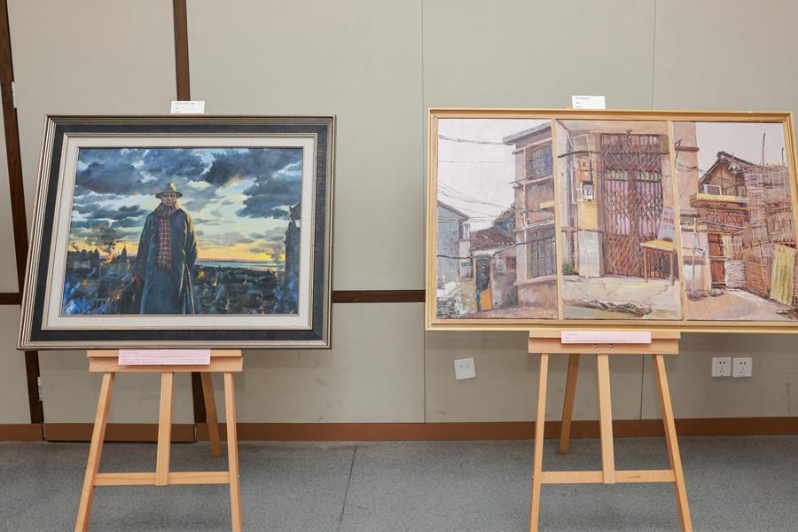 這些作品來自活躍在上海美術界的老中青年藝術家們的精心創作。例如,80歲老藝術家陸志文的《陳嘉庚故居》,筆觸間流淌着對抗戰期間愛國華僑領袖報國精神的敬意,兼具藝術創新與歷史厚重感;雕塑中堅力量蔣進軍的《無名英雄》,力量與美感兼備,詩意地致敬先烈、緬懷犧牲;青年藝術家謝曉霏的《烽火課堂,八秩迴響》,以時空對話的巧妙方式,讓和平的信念與堅韌的精神代代相傳。架上繪畫展獨有的藝術特點,則讓這些作品有了貼近市民的氛圍,既保留藝術創作的完整細節,又能讓大家近距離駐足觀賞。