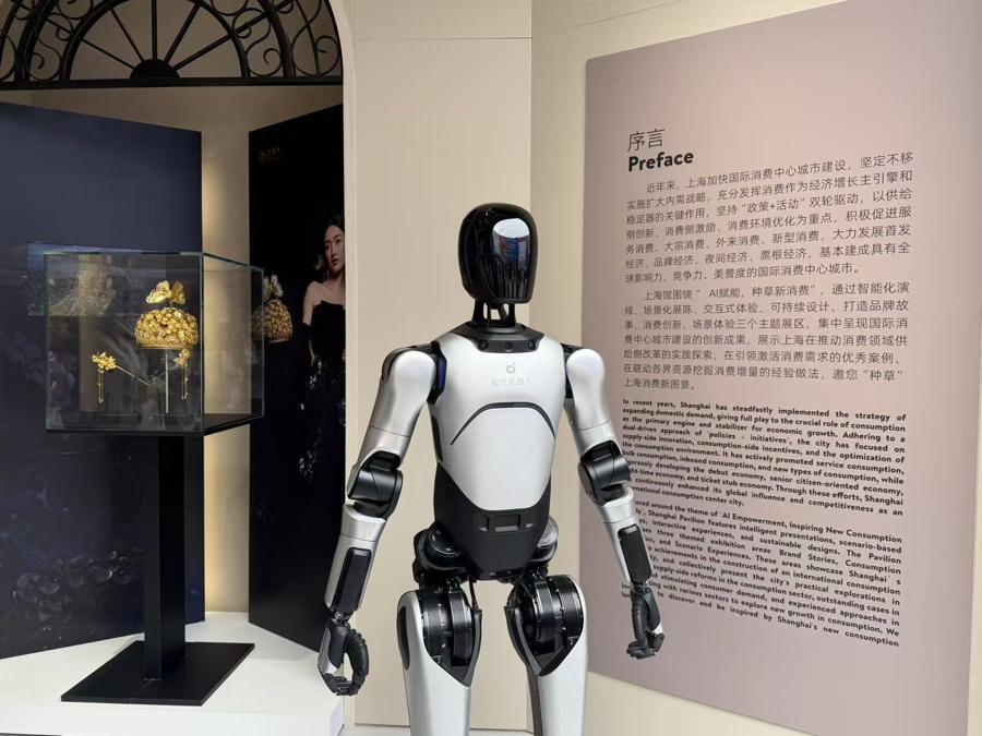 “您好,我叫小智,可以爲您介紹上海館的各類詳情。” 在第八屆進博會主場館中央廣場上海館,迎接訪客的是一位特殊的導覽員——來自智元科技的機器人“小智”。他介紹,今年上海館以“AI賦能,種草新消費”爲主題,內設有品牌故事、消費創新、消費體驗三大板塊,遊客可通過智能化演繹、場景化展陳、交互式體驗與可持續設計,感受上海的城市溫度與創新活力。