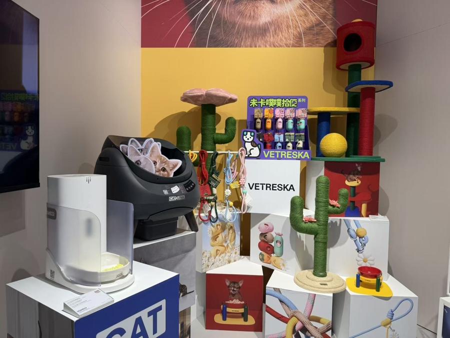 在寵物經濟區域,現場巨幅的貓咪海報和仙人掌造型的貓爬架來自寵物生活方式品牌未卡(VETRESKA),帶來貓臉識別餵食器和智能貓砂盆的CATLINK是國產貓砂盆品牌的佼佼者,它的產品橫跨全球119個國家和地區,服務超70萬個養貓家庭。