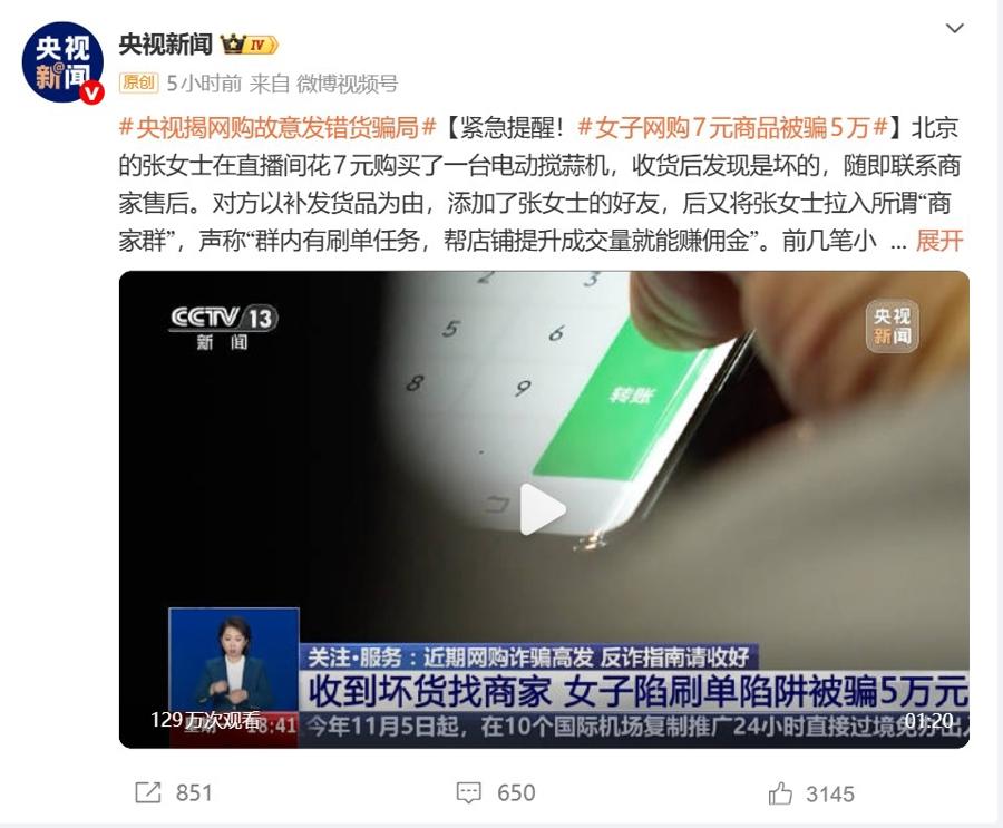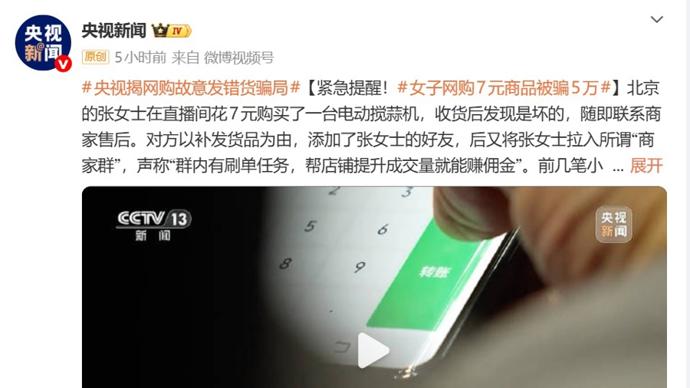 今天,#央視揭網購故意發錯貨騙局# 衝上社交媒體平臺熱搜第一名。用戶網購7元商品後,詐騙分子故意寄出殘次品,並以“售後理賠”爲由誘導添加私人聯繫方式。隨後通過小額刷單返利騙取信任,逐步誘導大額轉賬後便以操作失誤等藉口,吞沒資金5萬多元。警方提醒:引導至第三方平臺進行的“售後”或“刷單返利”都是詐騙,切勿相信。