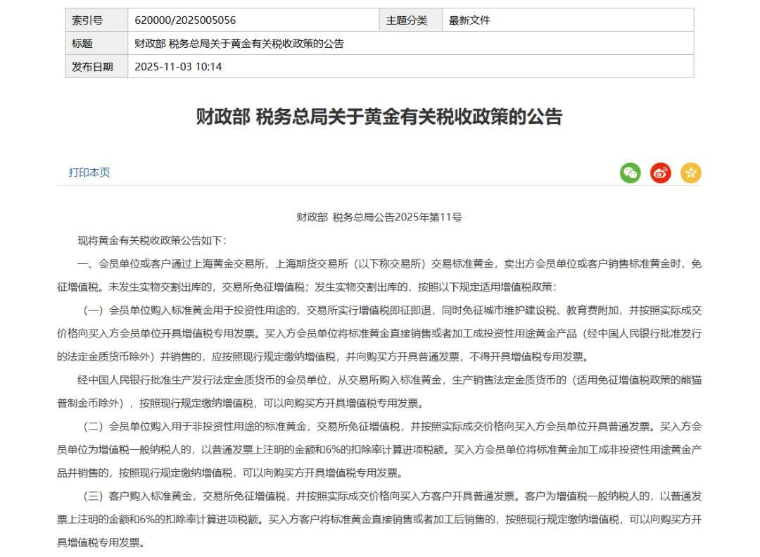 但在11月1日,財政部、國家稅務總局聯合發佈了一份重磅文件——《關於黃金有關稅收政策的公告》。