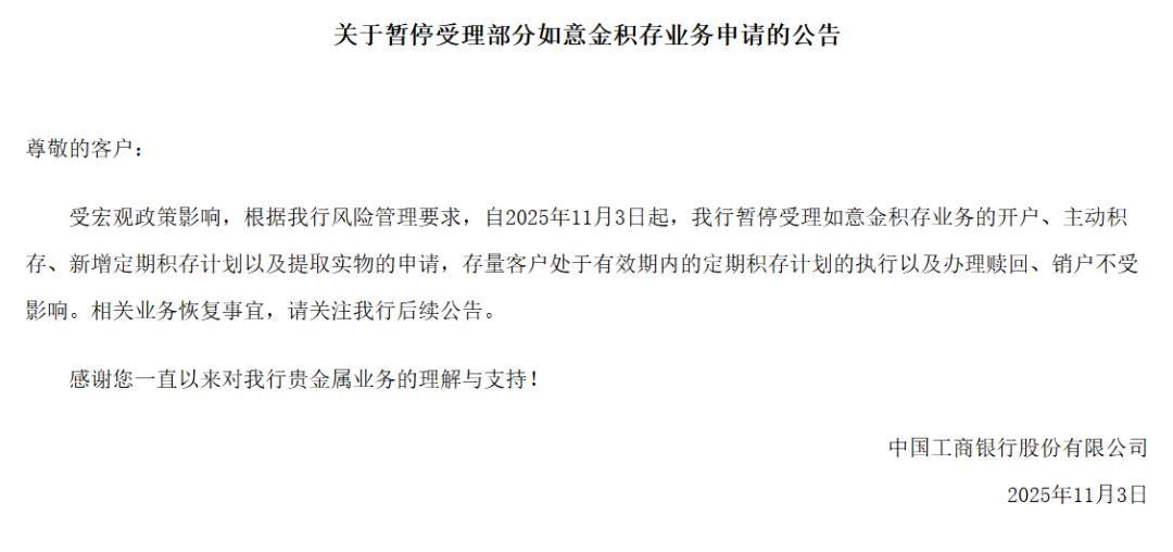 比如工商銀行在11月3日上午發佈公告稱,受宏觀政策影響,根據工商銀行風險管理要求,自2025年11月3日起,工商銀行暫停受理如意金積存業務的開戶、主動積存、新增定期積存計劃以及提取實物的申請。