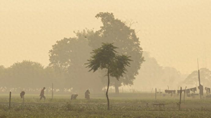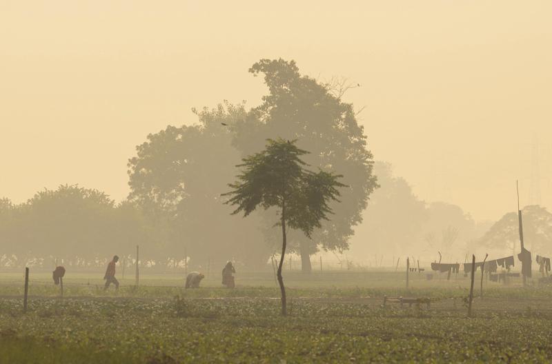 11月10日,在印度新德里,人們在霧霾中走在農田裏。 新華社發