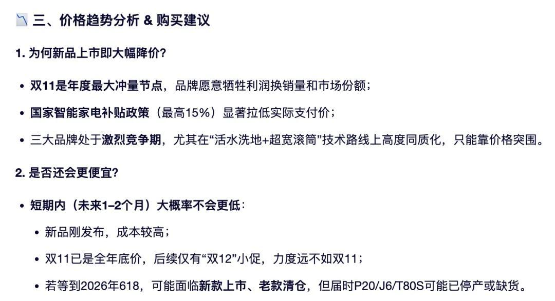 它還分析了爲什麼當下是最佳購買時點:12月的促銷力度不如雙十一、明年618又可能出現缺貨。
