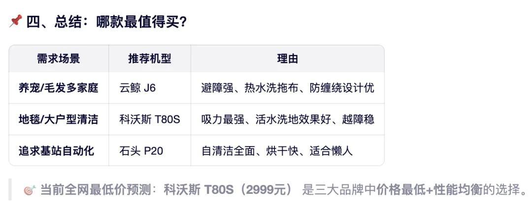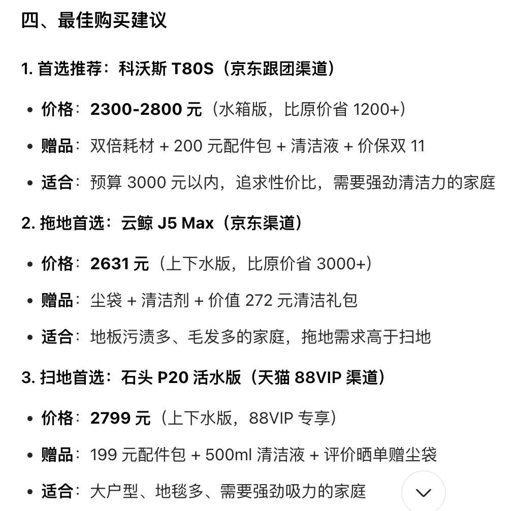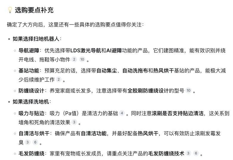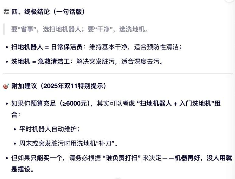 它甚至還給了一個附加答案:如果預算充足,可以考慮“掃地機器人+入門洗地機”組合購買。