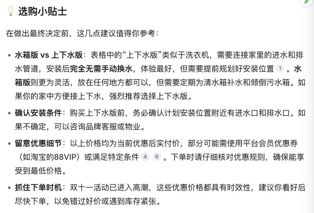 DeepSeek雖然沒給出最終建議,但優點是情緒價值很足,列出了一連串“選購小貼士”,每一條都很實用。