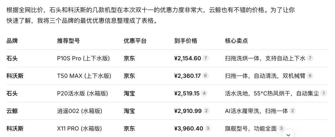 於是,我們同時向三個大模型提問:“我想在2025年雙十一期間以最優惠的價格買一臺品牌掃地機器人,請幫我全網搜索出優惠力度最大的產品。”