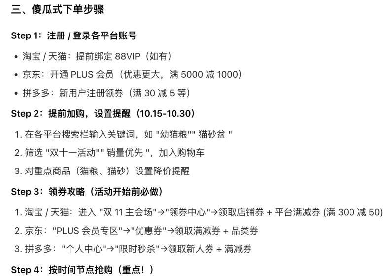 於是,我們出了一道終極考題:“幫我列出一份3個月大小貓所需寵物用品的詳細清單,推薦合適的產品品牌和款式,再基於電商平臺的優惠活動,做成一個分步的傻瓜式下單攻略,確保能以最便宜的價格拿下清單裏的物品。”