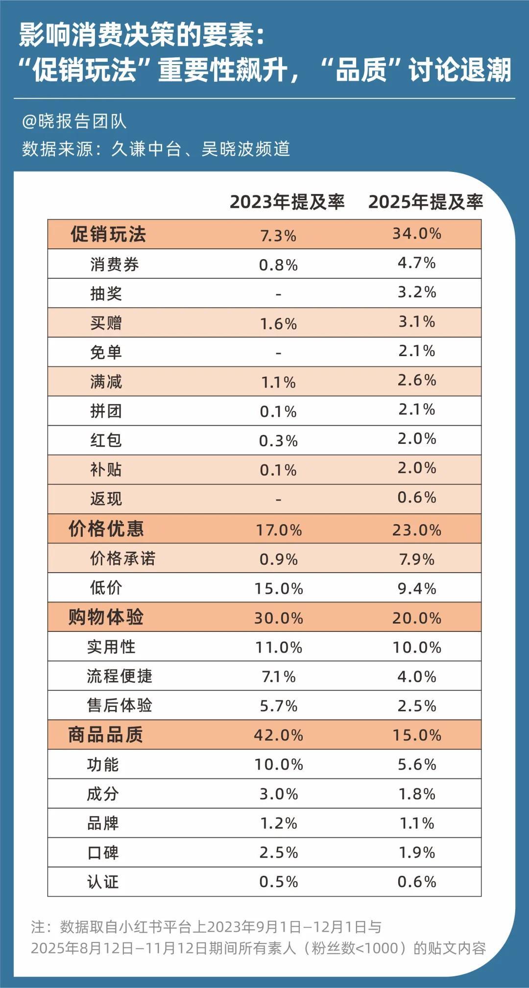 久謙中臺數據顯示,在社交平臺的討論聲量中,“促銷玩法”的提及率叫兩年前激增近五倍,一舉超越“價格優惠”“購物體驗”和“商品品質”,成爲影響購買的首要因素。其中,“消費券”“抽獎”“免單”“拼團”等遊戲化玩法成爲焦點。