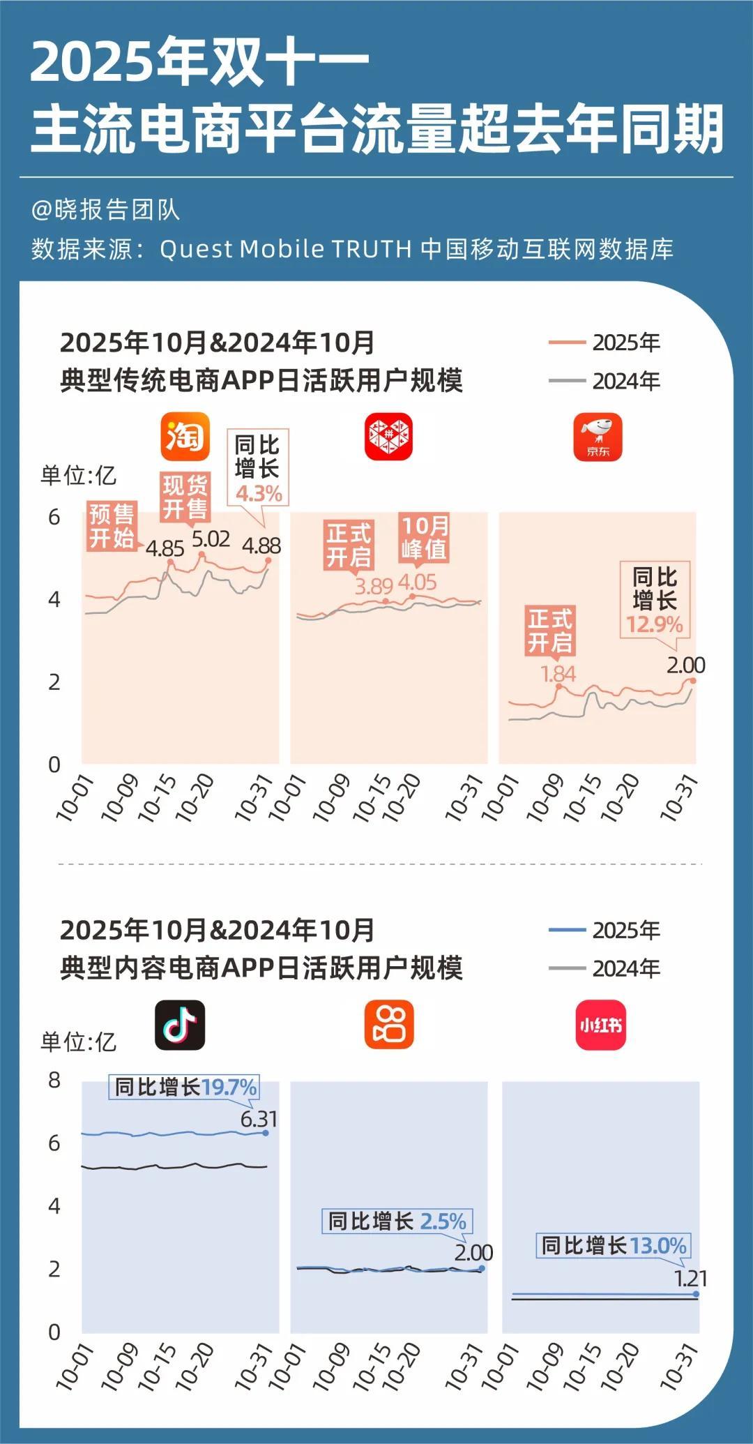 “閃購大戰”的勢能就此延續到了雙十一,爲主流電商平臺帶來了新增量:今年10月,雙十一剛開幕,淘寶平臺日活用戶4.88億,同比增長4.3%。“京東”也收穫了不錯的成績,10月平臺日活用戶同比增幅達到12.9%。