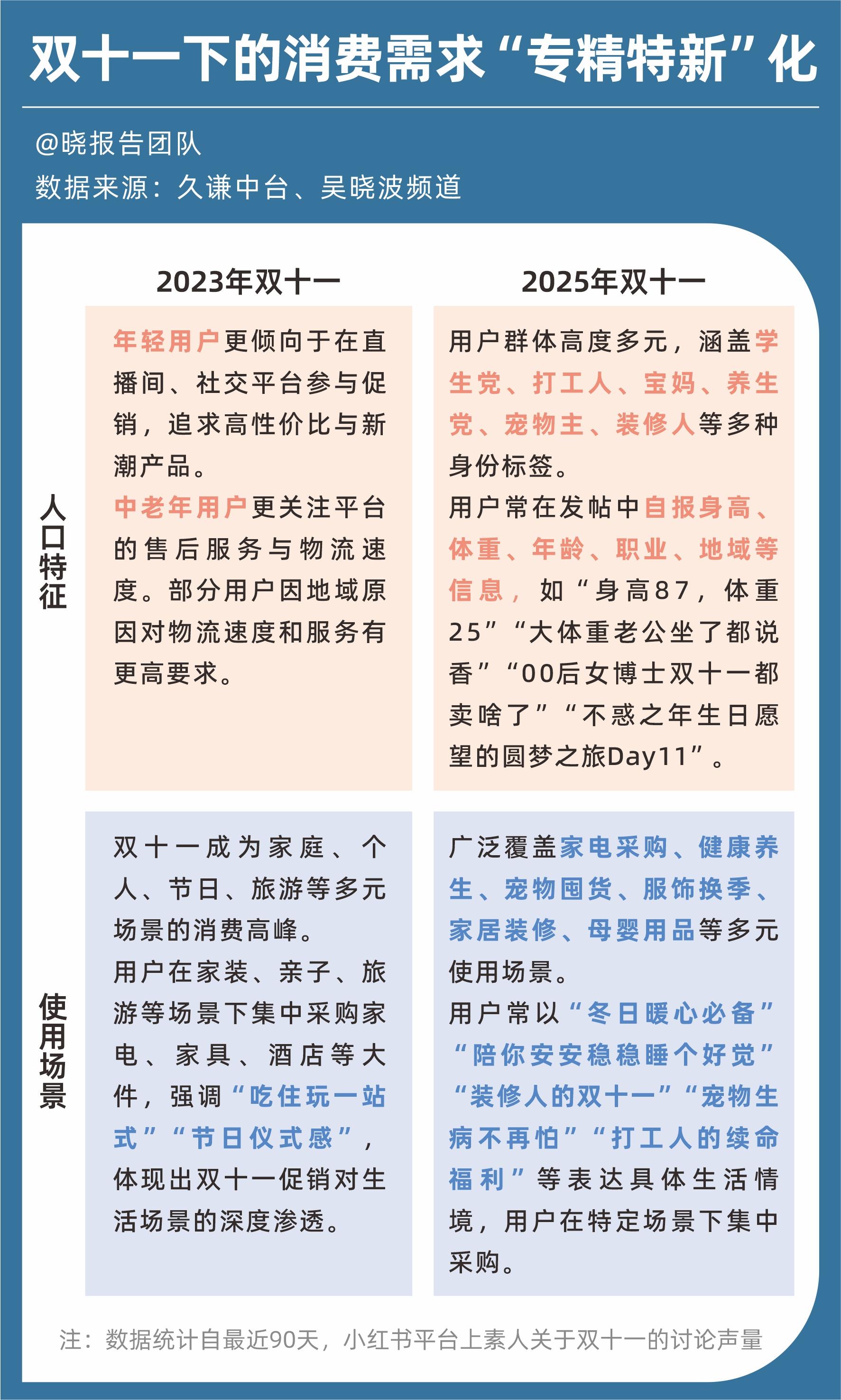 根據久謙中臺統計數據,今年雙十一期間,社交平臺上,消費者主動以“大體重老公”“00後女博”“裝修人”“養生黨”“不惑之年”等標籤自我歸類,不僅如此,他們還會在產品評論中留言“冬日暖心必備”“裝修人的雙十一”“寵物生病不再怕”“打工人的續命福利”等生活情景——這或許正是這些“專精特新”行業券的靈感來源。