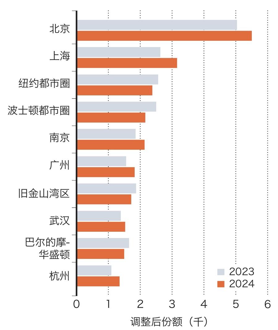 據施普林格·自然介紹,這份增刊聚焦2024年全球主要城市及都市圈在“自然指數”追蹤的高質量期刊上的最新科研產出變化。根據榜單,2024年全十大科研城市依次爲北京、上海、紐約都市圈、波士頓都市圈、南京、廣州、舊金山灣區、武漢、巴爾的摩–華盛頓,以及杭州。