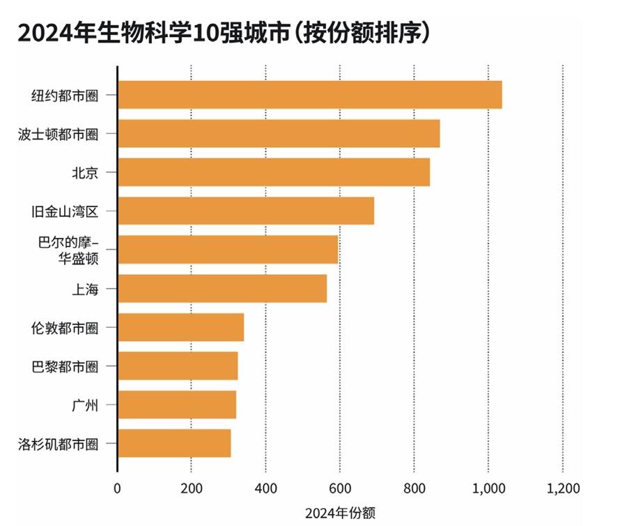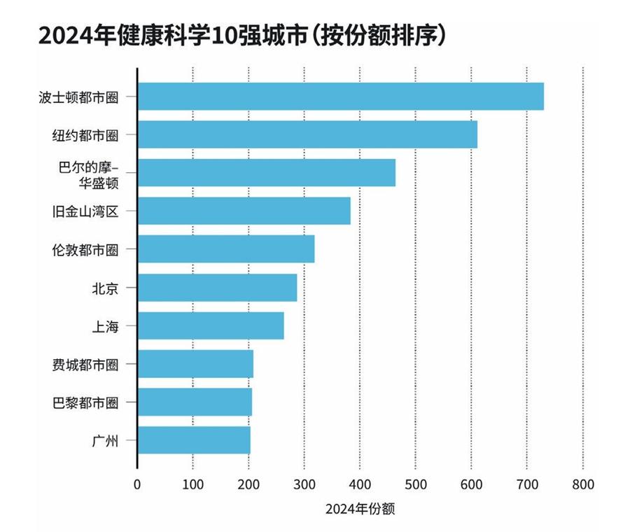 不過,在生物科學和健康科學領域,歐美城市仍保持領先地位。在生物科學領域,十強科研城市大多來自歐美,紐約和波士頓位居前兩位,北京第三,上海排名第六,但份額與波士頓相差不到30,而廣州從2023年的第13位上升到第9,增長顯著。