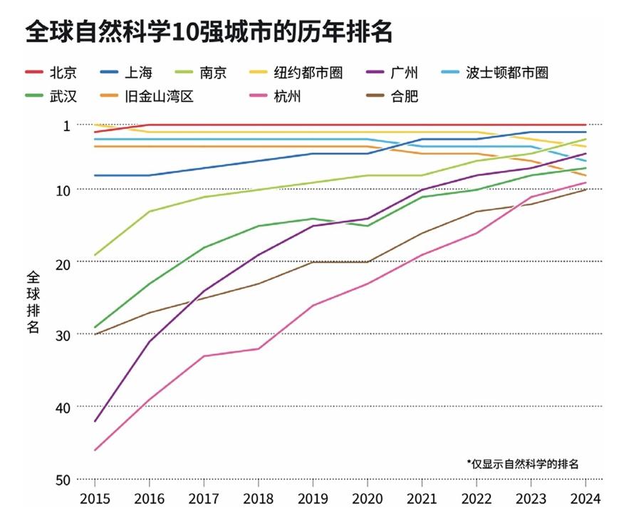 而據同期《自然》增刊發佈的全球自然科學十強城市近十年走勢圖,多箇中國城市排名大幅提升:北京自2016年超過紐約後,一直居於榜首;上海緊隨其後,從2016年位居第八到2023年、2024年蟬聯第二。此外,南京從第19位(2015年)升至第3位(2024年)、廣州則從第42位(2015年)升至第5位(2024年),杭州也從第46位(2015年)升至第9位(2024年)。