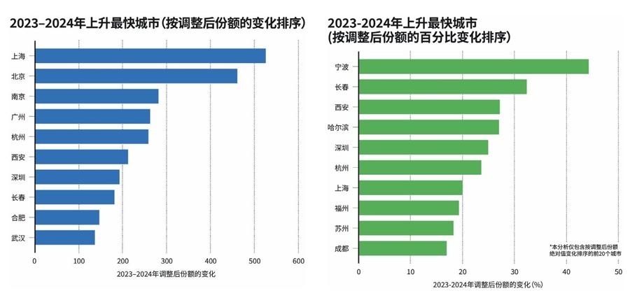 如果按照百分比變化統計,上升最快的20強城市中,寧波以增幅爲44.26%位居第一,長春和西安緊隨其後,增幅分別爲32.35% 和27.16%。