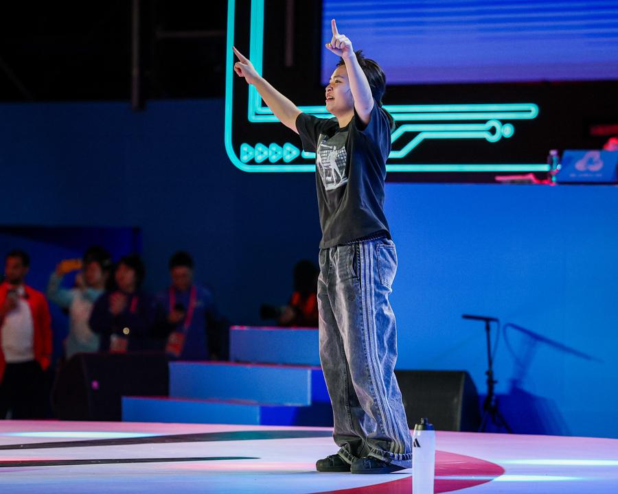 廣州體育學院亞運館內,紅藍交織的燈光渲染出濃郁的賽博朋克風格。主持人報幕時總是習慣性地拖長尾音,並不時穿插英文,爲現場增添了幾分國際化的感覺。