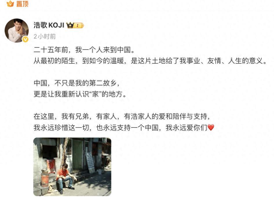 “中國,不只是我的第二故鄉,更是讓我重新認識‘家’的地方。在這裏,我有兄弟,有家人,有浩家人的愛和陪伴與支持,我永遠珍惜這一切,也永遠支持一箇中國,我永遠愛你們”。