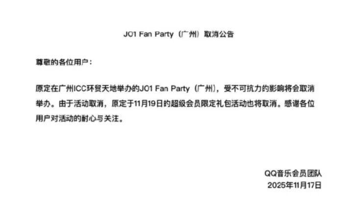 17日晚,QQ音樂在社交網站上發佈一則公告稱,“原定在廣州舉辦的JO1 Fan Party,受不可抗力的影響將會取消舉辦。”