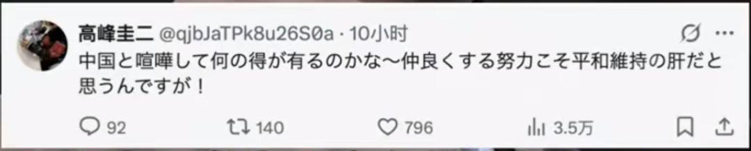 和中國發生衝突有什麼好處呢?我覺得,唯有努力搞好關係,纔是維護和平的關鍵呀!