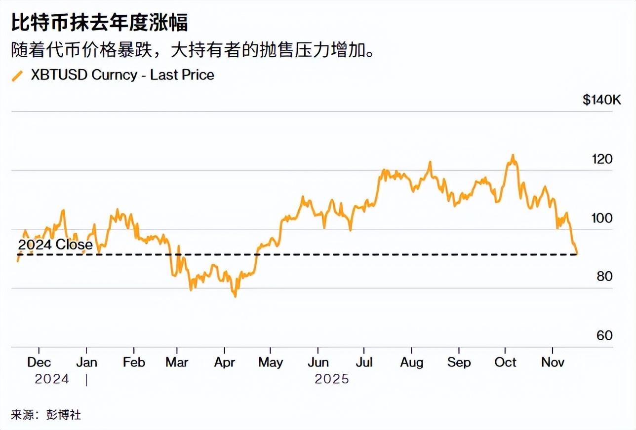 另一大重災區是加密貨幣。比特幣從10月份的12.6萬美元開始下跌,並一度跌破9萬美元。