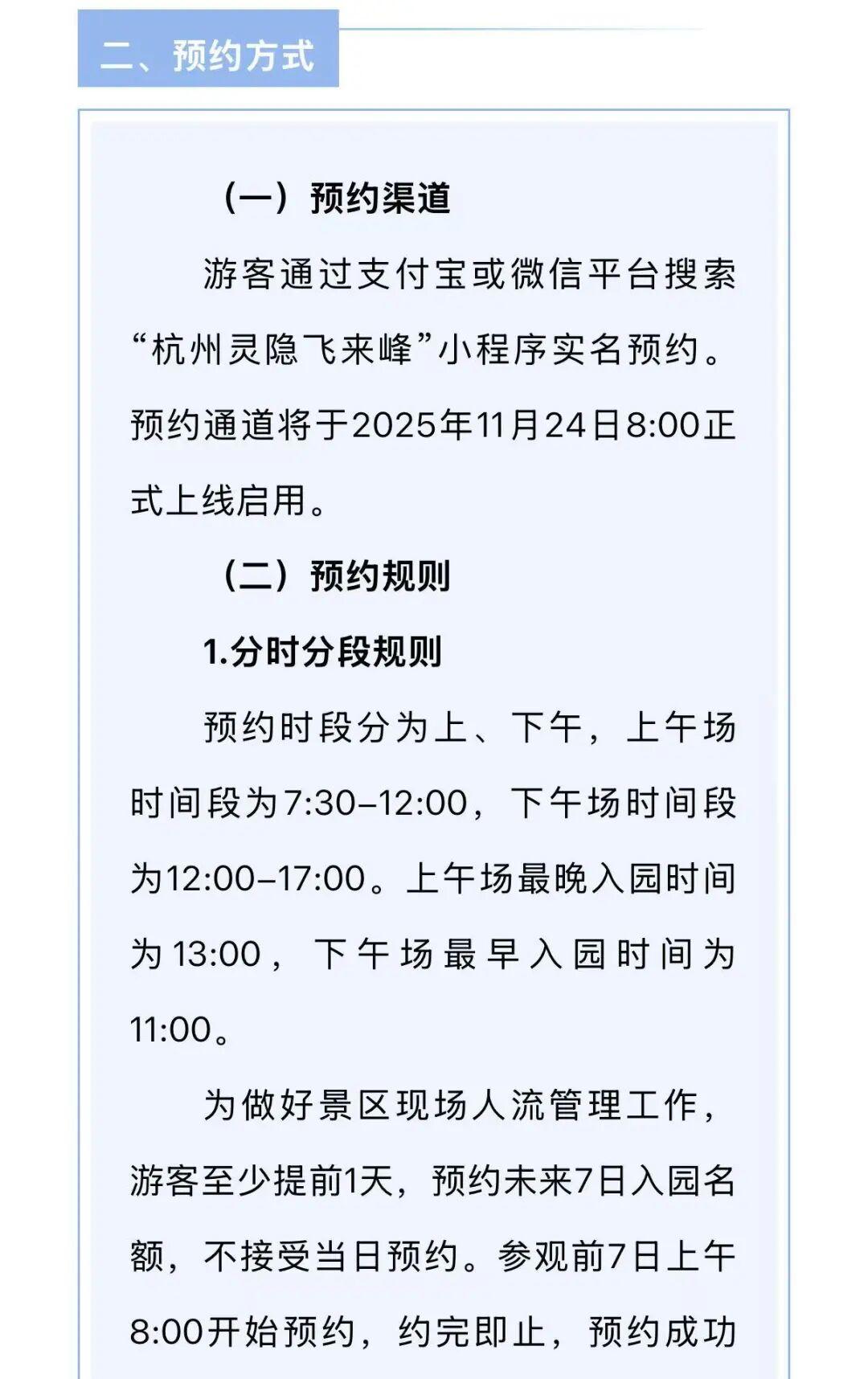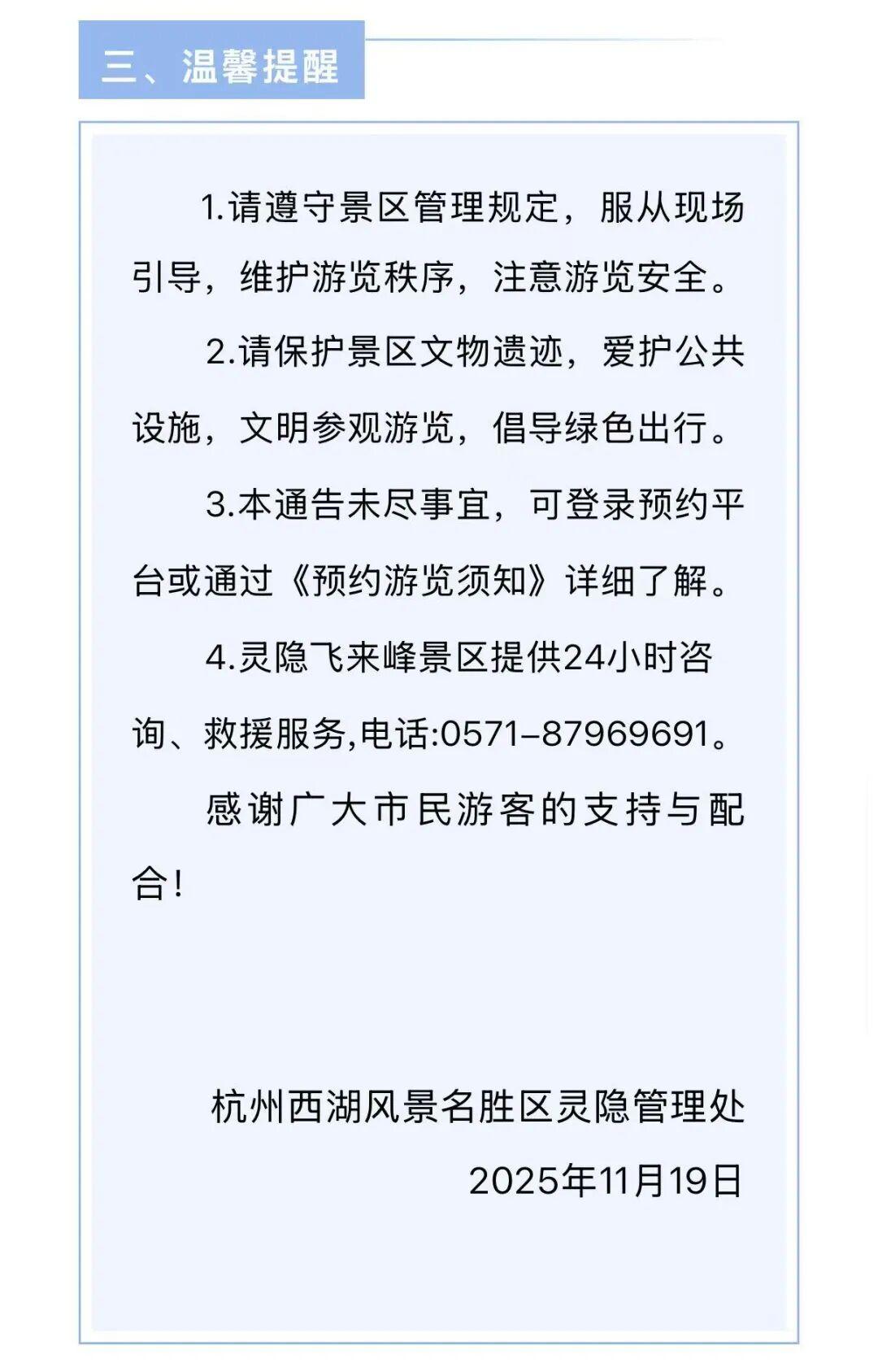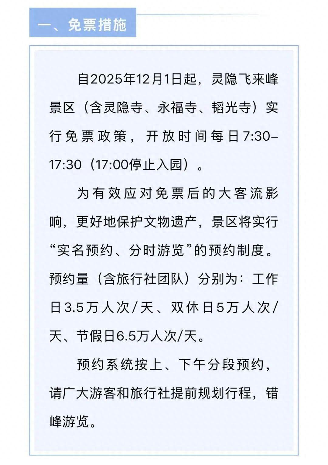 11月19日,@中國藍新聞 記者從杭州西湖景區官方賬號瞭解到,自2025年12月1日起,靈隱飛來峯景區(含靈隱寺、永福寺、韜光寺)實行免票政策,開放時間每日7:30-17:30(17:00停止入園)。