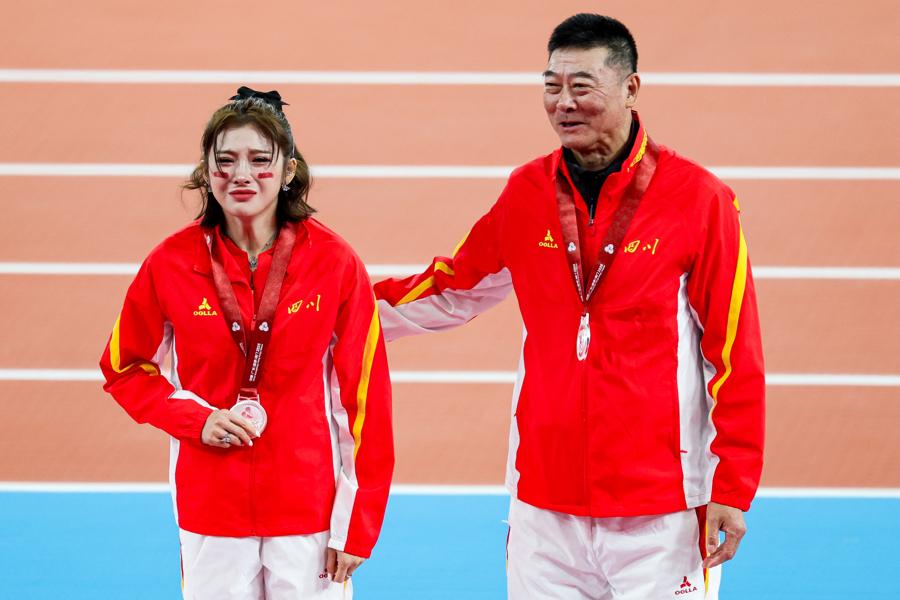 “我給自己打零分,沒能拿到冠軍心裏非常難受,可能老天還在考驗我。”吳豔妮賽後難掩失落。頒獎儀式上,手捧銀牌的她依然情緒低落,站上領獎臺時不禁掩面痛哭,不斷抽泣。一旁的教練則面帶微笑,一直在旁安慰。