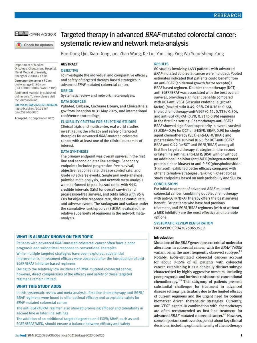 研究首次通過多模型交叉驗證確認:EGFR/BRAF雙靶治療是BRAF突變腸癌的核心治療基石。值得關注的是,長征醫院腫瘤科設計的“雙靶雙化”方案,在系統性評估中展現出優秀的治療效果與可控的安全性,被證實爲該難治性腸癌人羣的首要選擇。