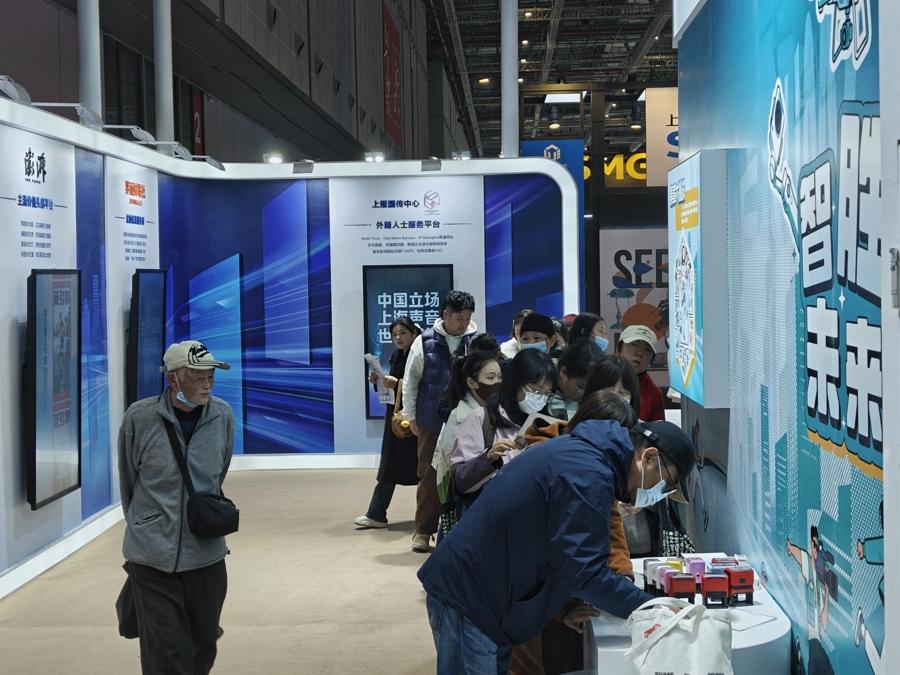 在上海報業集團位於5.2館的展臺前,參與“集章大挑戰”的觀衆排起了長隊。“這個設計太親切了!我父母常年讀報,而我每天都會刷上觀新聞和澎湃。”正在排隊的李舒驊表示,他準備用11枚印章拼出集團標識,在互動中感受傳統媒體與數字閱讀的深度交融。