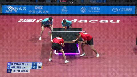 首盤雙打比賽,上海隊派出許昕/周愷對陣北京隊馬龍/黃友政。前兩局雙方戰平,此後馬龍/黃友政連勝兩局,爲北京隊佔得先機。
