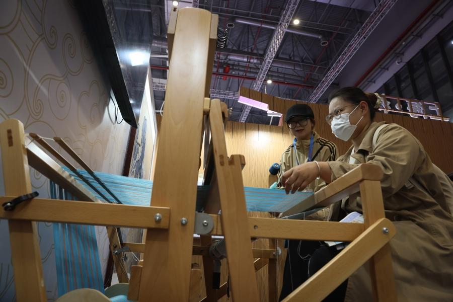 在四時和院金石篆刻區裏,將泗涇古鎮、南村草堂等松江知名地標刻入印章,在傳統文人雅趣中挖掘地標符號的別樣表達。鼎天時尚織造區裏,由南宋朱克柔創作的經典緙絲作品《蓮塘乳鴨圖》也在提花織造數字孿生技術的輔助下一展風姿,十足吸睛。尤爲值得一提的是,鼎天時尚還通過AI技術糅合創作,爲這幅未完成版的傳世名作補上了“未盡之筆”,也讓松江提花在數字時代煥發新生。