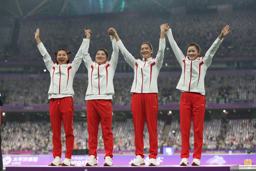 2023年杭州亞運會,葛曼棋(左一)、袁琦琦(左二)、韋永麗(左三)、梁小靜(左四)共同奪得女子4×100米接力金牌(視覺中國)