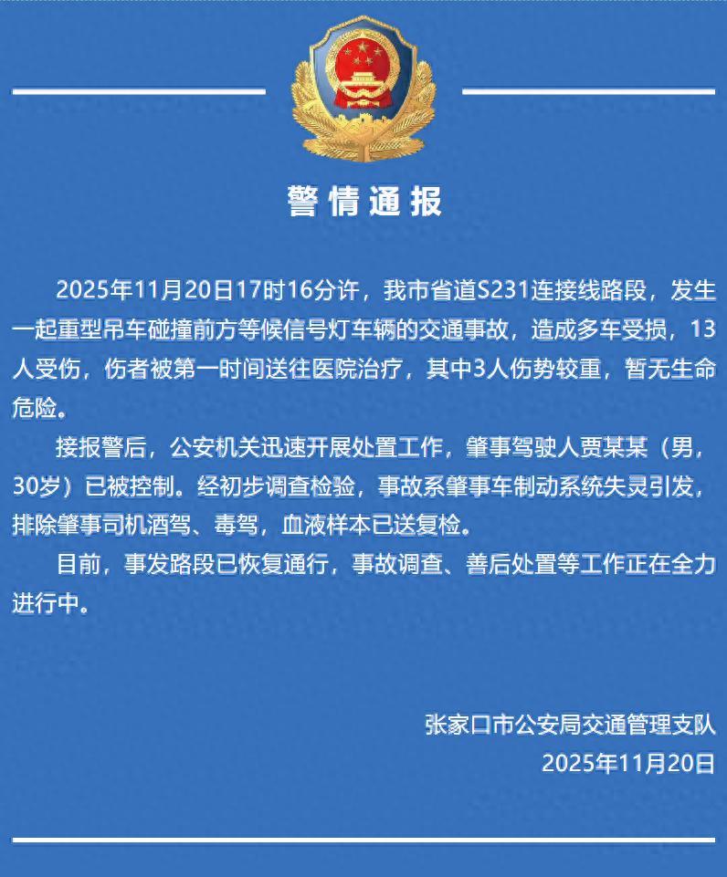 張家口發生一起交通事故致13人受傷,警方通報:重型吊車制動失靈,碰撞等信號燈車輛,肇事司機已被控制