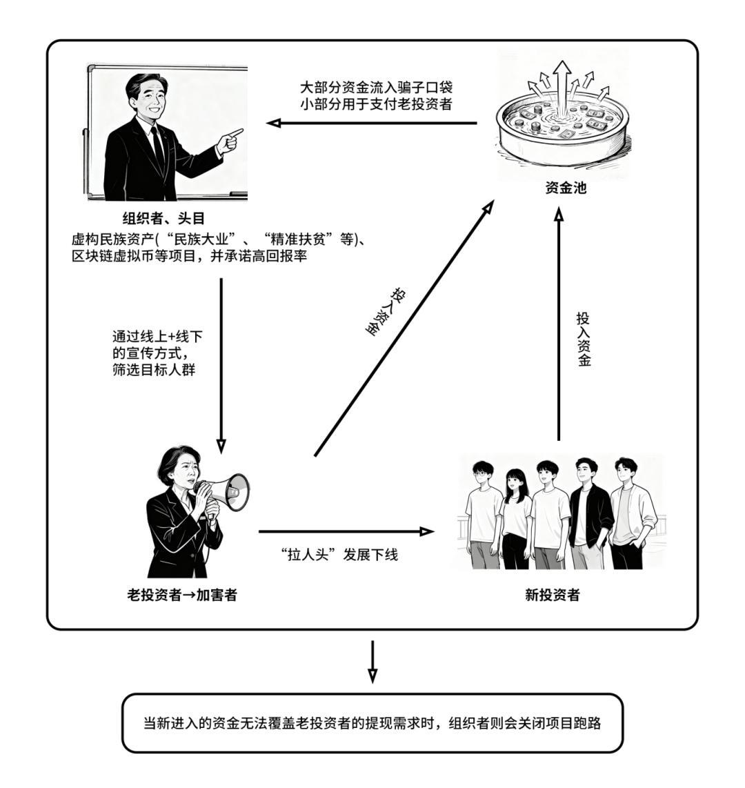 組織團伙往往打着國家、民族的旗號,通過僞造國家機關公文、證件、印章,編造國家相關政策等非法手段,虛構各類 “投資項目”,如“歷史民族資產”“鄉村振興”“精準扶貧”“惠民生國債”,或是打着“區塊鏈虛擬貨幣”旗號的項目,宣稱 “免費挖礦”,無需實際操作即可通過“算力增值”“幣價上漲”獲利。