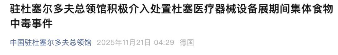 中國駐杜塞爾多夫總領館20日向新華社記者證實,17日赴德國參加2025年杜塞爾多夫國際醫療器械設備展的上百名中方參展人員出現食物中毒症狀。