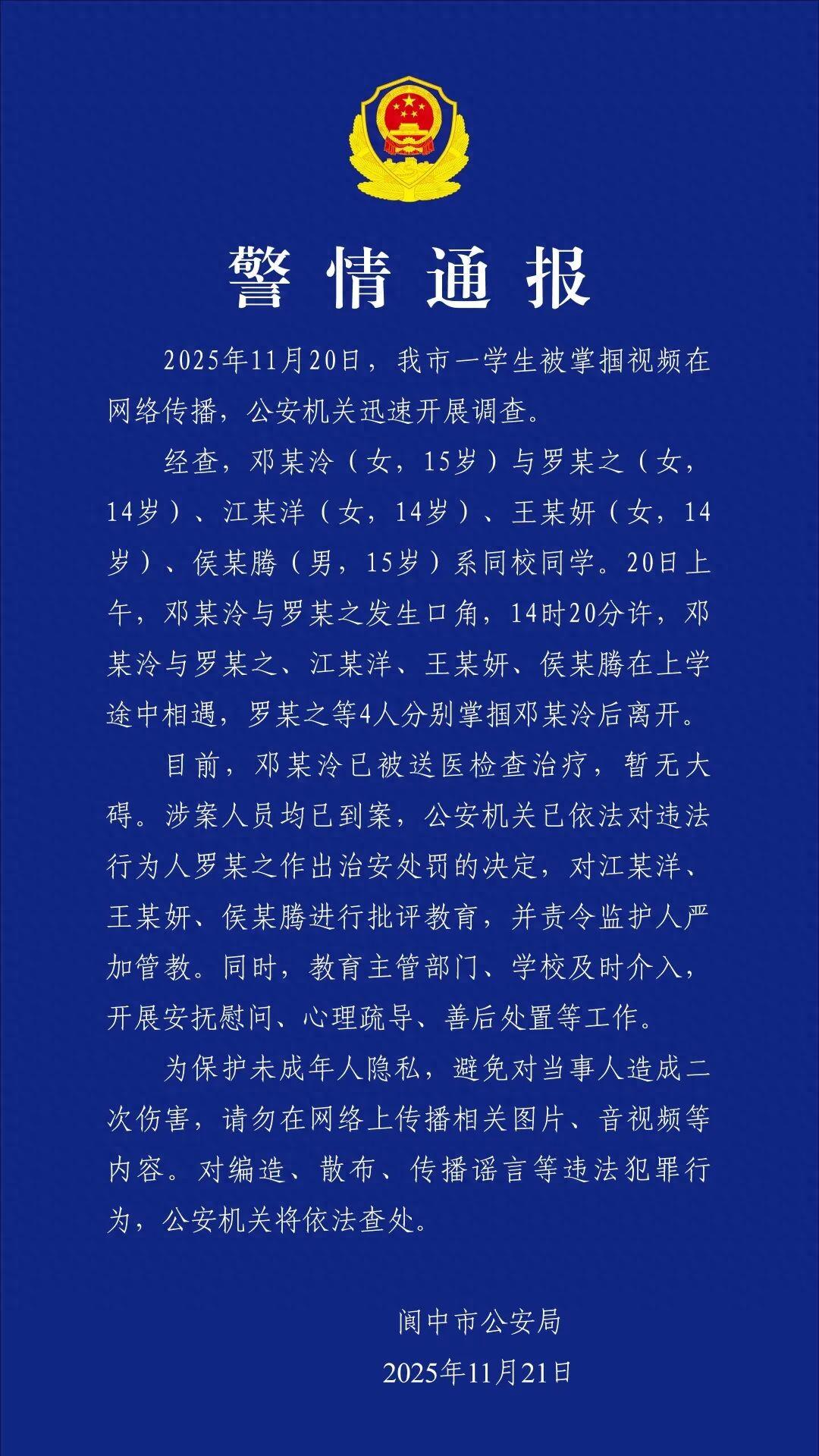 2025年11月20日,我市一學生被掌摑視頻在網絡傳播,公安機關迅速開展調查。
