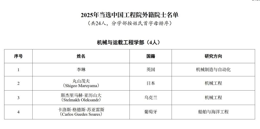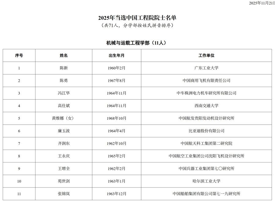 11月21日,中國工程院公佈了2025年院士增選當選院士名單、當選外籍院士名單。
