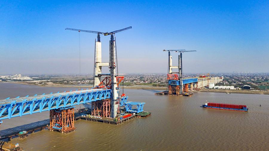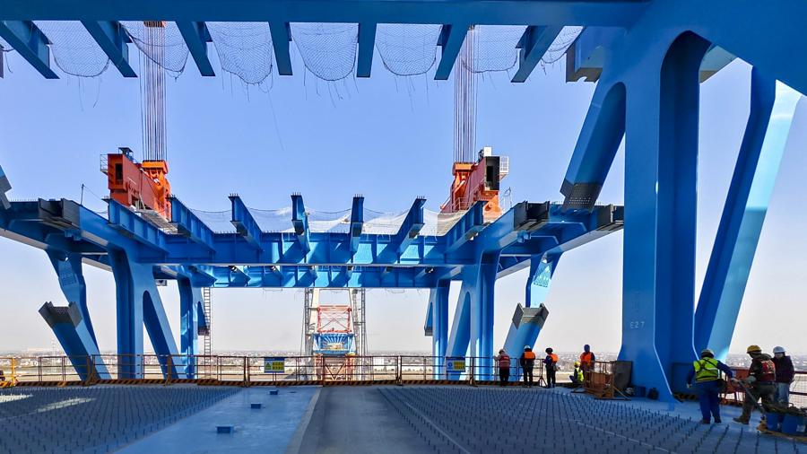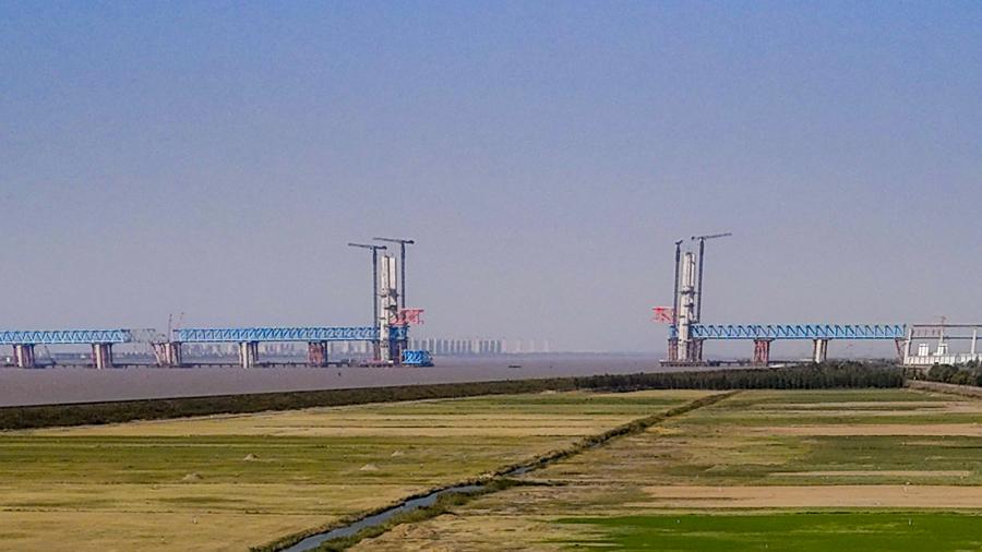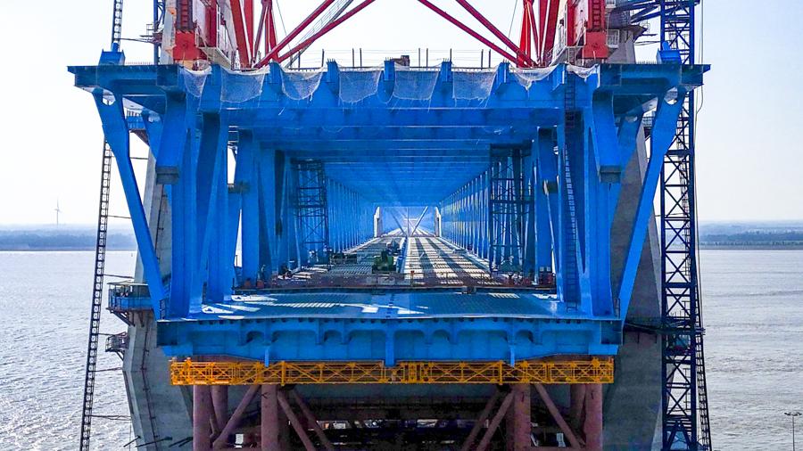 11月20日,隨着大橋北岸(啓東側)最後一段邊跨鋼樑精準落位,歷時158天、吊裝跨度達1205.4米的崇啓跨江公鐵大橋非通航孔水上吊裝作業圓滿完成,項目整體施工進度達80%,這標誌着國家“八縱八橫”高速鐵路網沿江高鐵通道的控制性工程離正式建成又向前邁出一大步。
