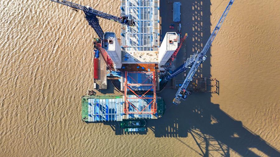 崇啓公鐵大橋非通航孔水上吊裝作業圓滿完成,海事部門全力保障“毫米級”施工