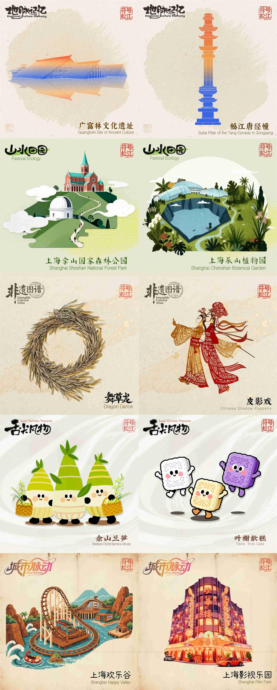 據介紹,“符號松江”文化標識設計分爲地脈記憶、山水田園、非遺圖譜、舌尖風物、城市脈動等主題系列。創作者們將松江的文化意象提煉爲可感知的視覺語言,通過幾何抽象、低飽和撞色等手法重構文化認知框架,建立符合Z世代信息接收習慣的視覺敘事,從文化內核到視覺風格上對松江城市意象全面煥新。