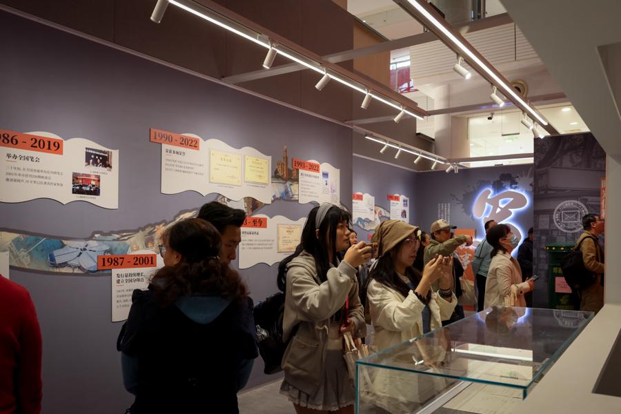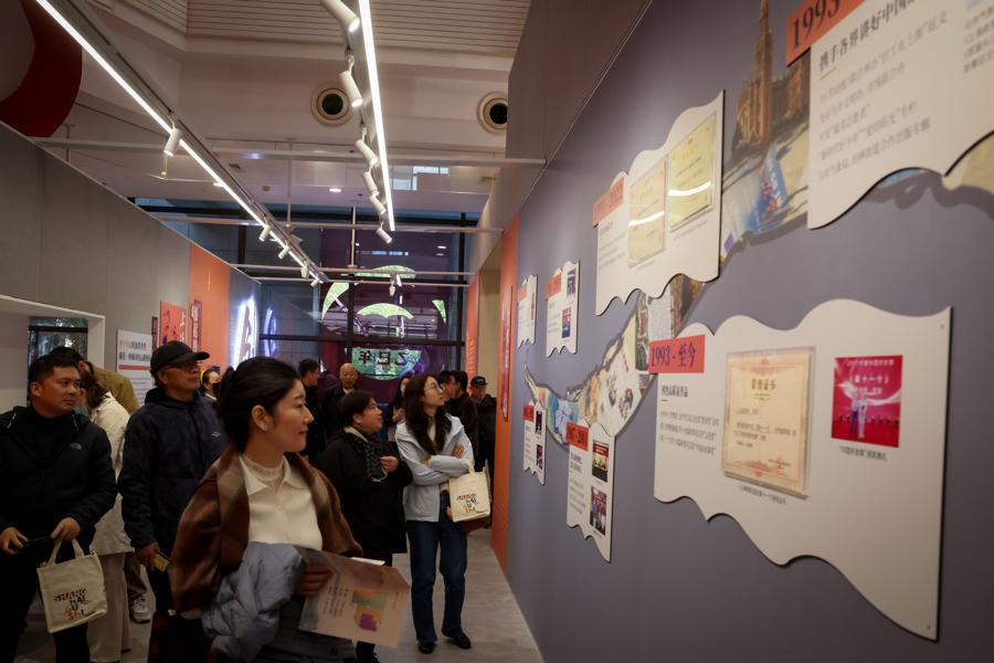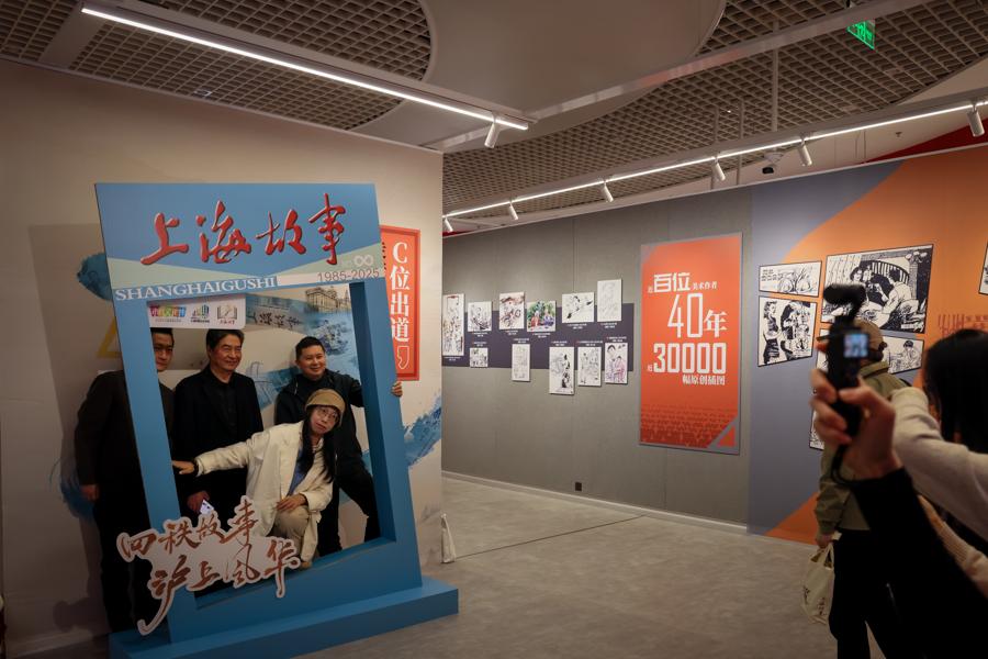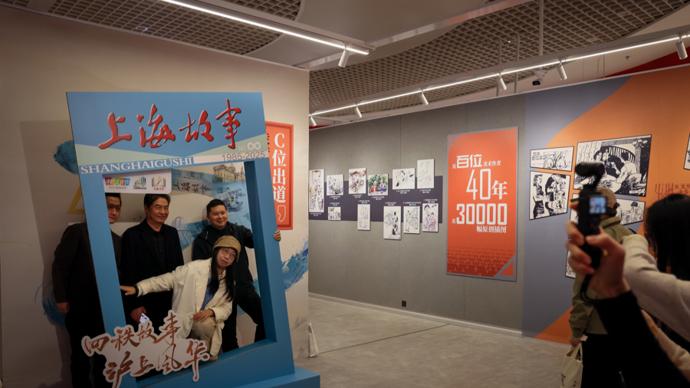 嘉賓在《上海故事》創刊四十週年回顧展上打卡留念。