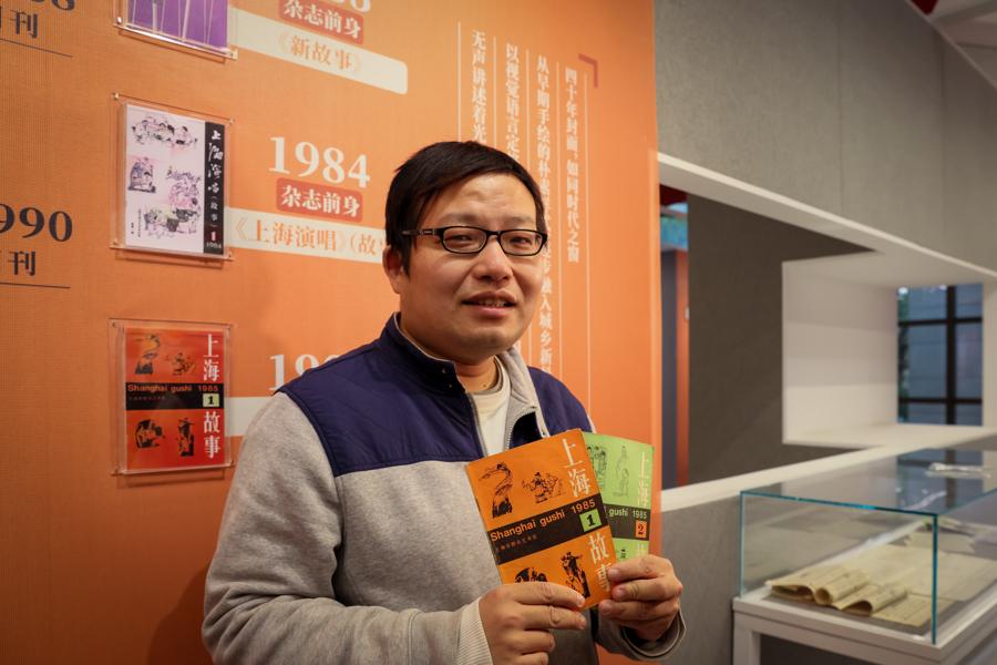 展覽現場,讀者孔祥斌向記者展示他收藏的《上海故事》創刊號。