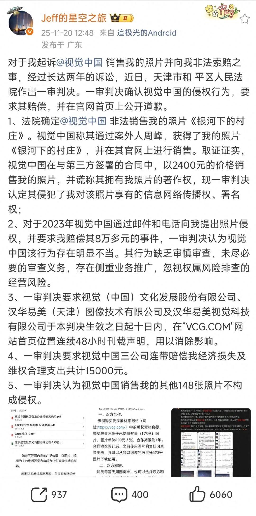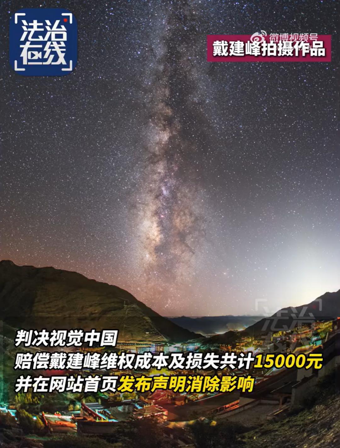 今年11月20日,戴建峯發微博稱,法院一審判決認爲,由視覺中國簽約供稿人周某盜用戴建峯作品並違規上傳的《銀河下的村莊》構成侵權,應賠償戴建峯15000元並消除影響;視覺中國銷售戴建峯的另外148張照片不構成侵權。