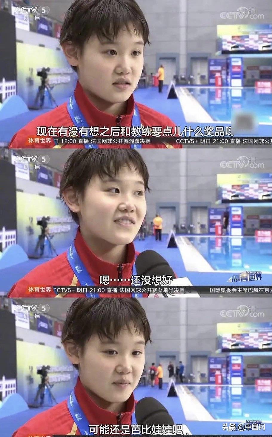 隨後記者又問,拿到這個不錯的成績後,有沒有想過和教練要點什麼獎品呀?一個十幾歲的小姑娘單純又直率地對着鏡頭說:還沒想好,可能還是芭比娃娃吧,因爲我比較喜歡~