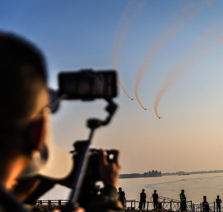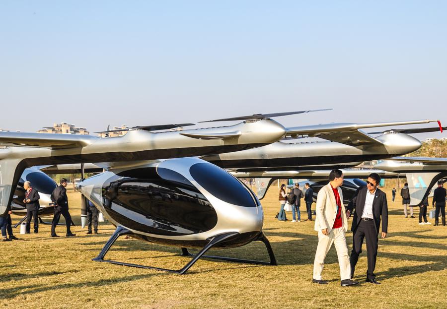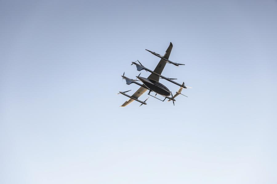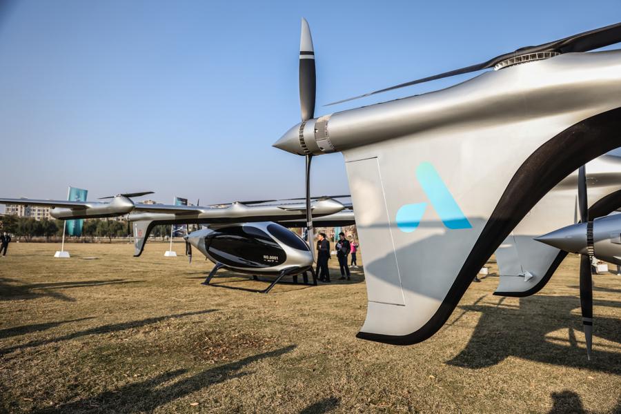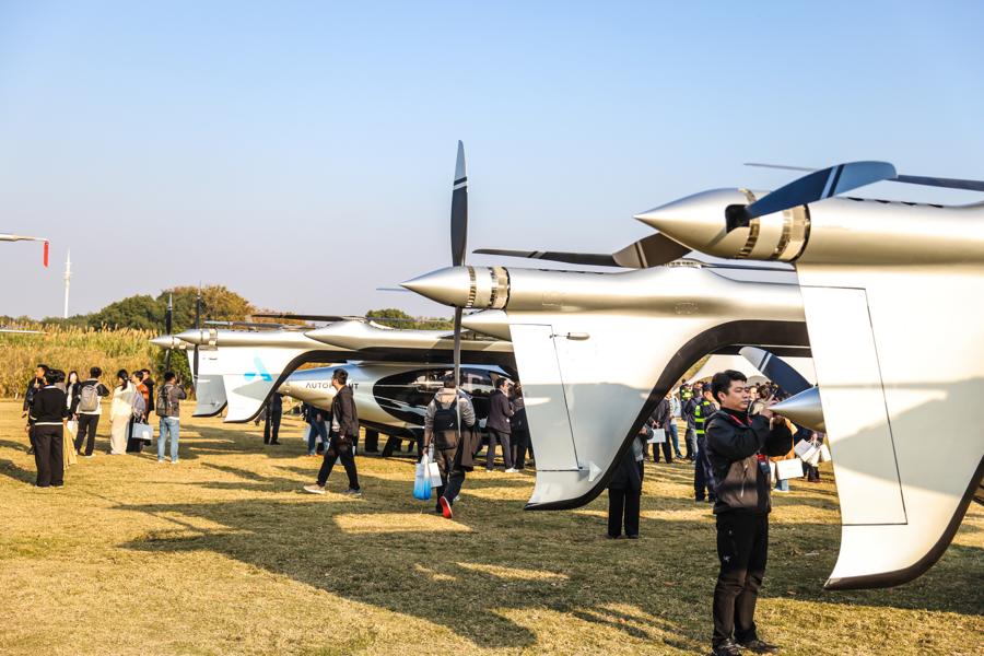 圖爲峯飛航空在崑山澱山湖水面上空進行了多架機編隊實景演示,三架2噸級eVTOL編隊飛行。