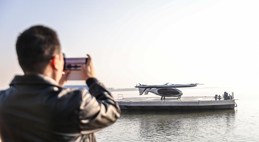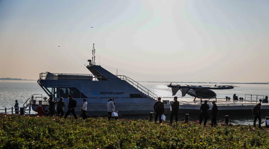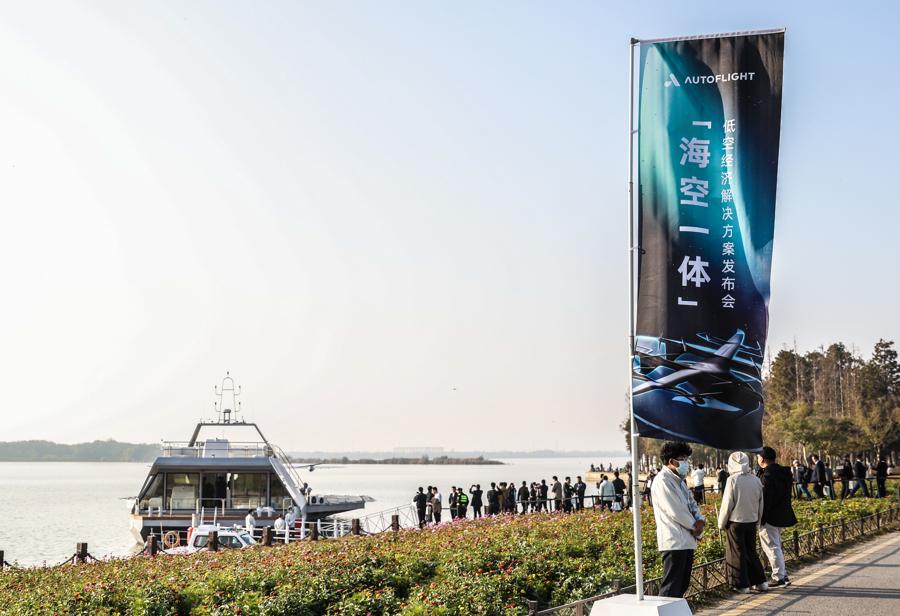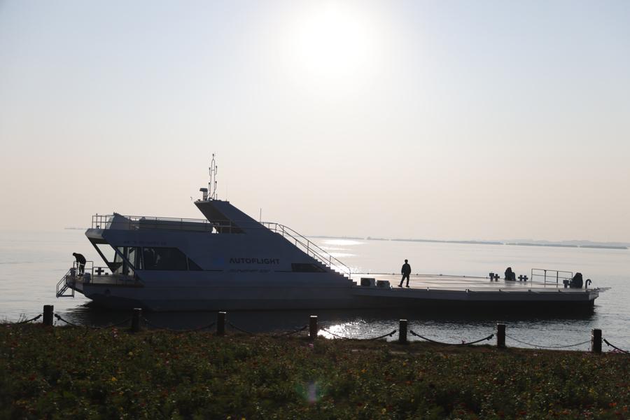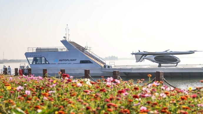11月22日,我國自主研發的2噸級eVTOL(電動垂直起降航空器)在崑山澱山湖畔首次公開演示“海空一體”方案。記者在現場看到,該機型從零碳水上機場起飛,首次通過“水域+低空”聯動方案,展示零碳機場與eVTOL的協同作業能力。