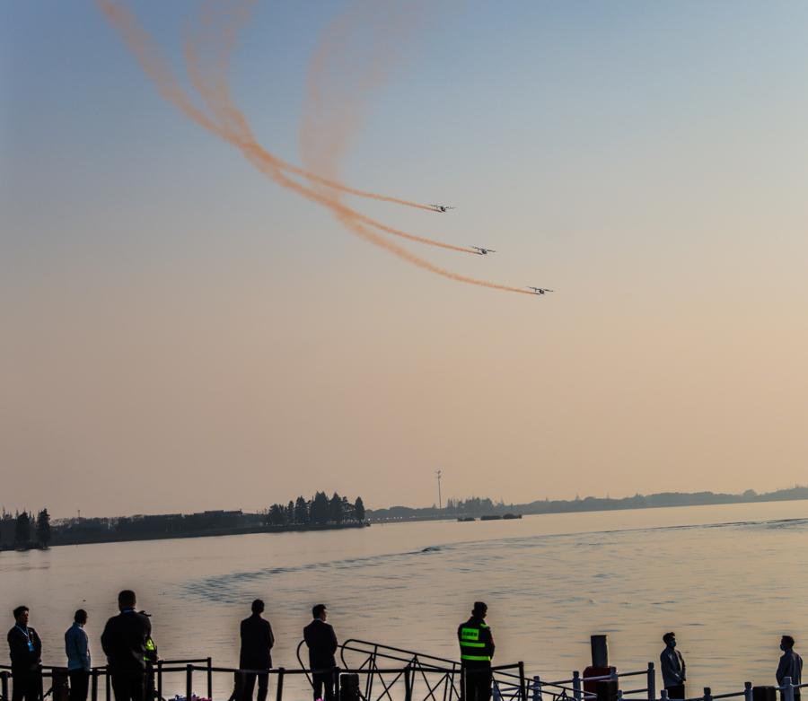 圖爲三架2噸級eVTOL編隊飛行,拉出三條橙黃色的尾煙,在水天之間劃出絢麗的弧線。