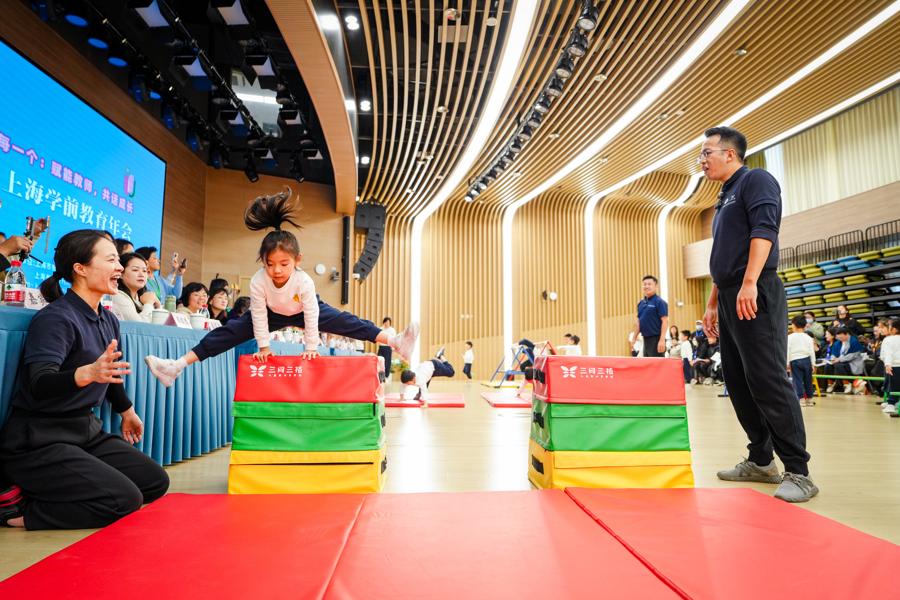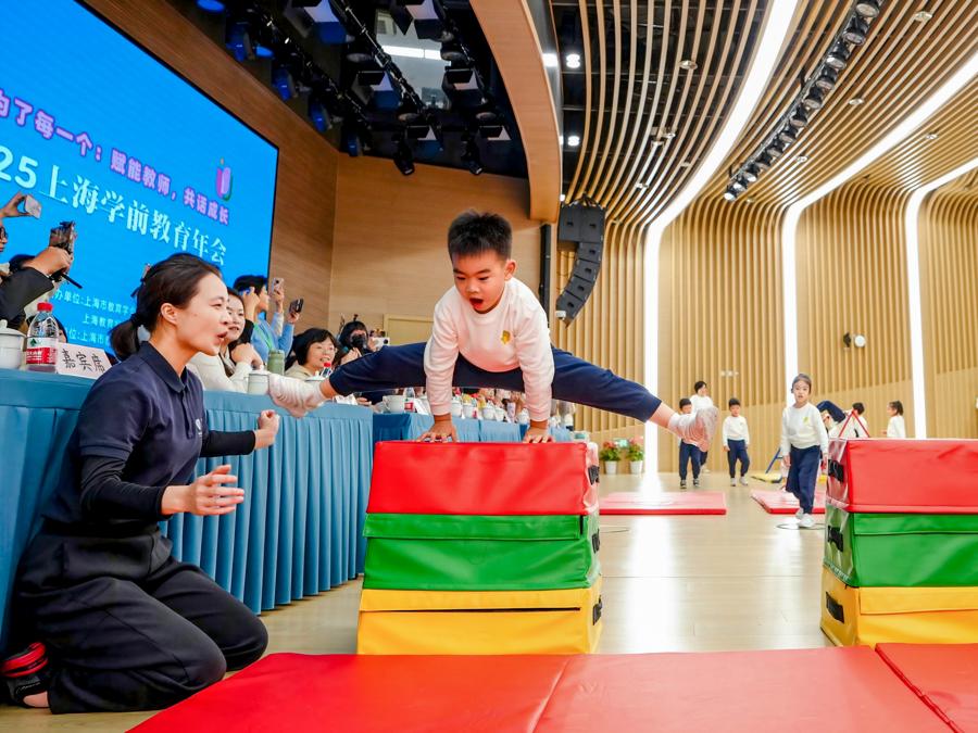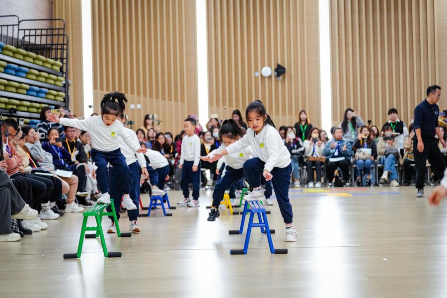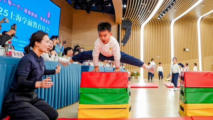 3歲的孩子做前滾翻,4歲的孩子嘗試單槓翻轉,5、6歲的孩子挑戰橫箱跳馬……日前,在2025年上海學前教育年會中國福利會託兒所展示專場上,一些學齡前幼兒在近半小時的中高強度活動中,不僅“拿”下了這些有難度的動作,更表現出了身體的靈活性、協調性以及身體力量和平衡性,讓現場的學者和教師讚歎不已。