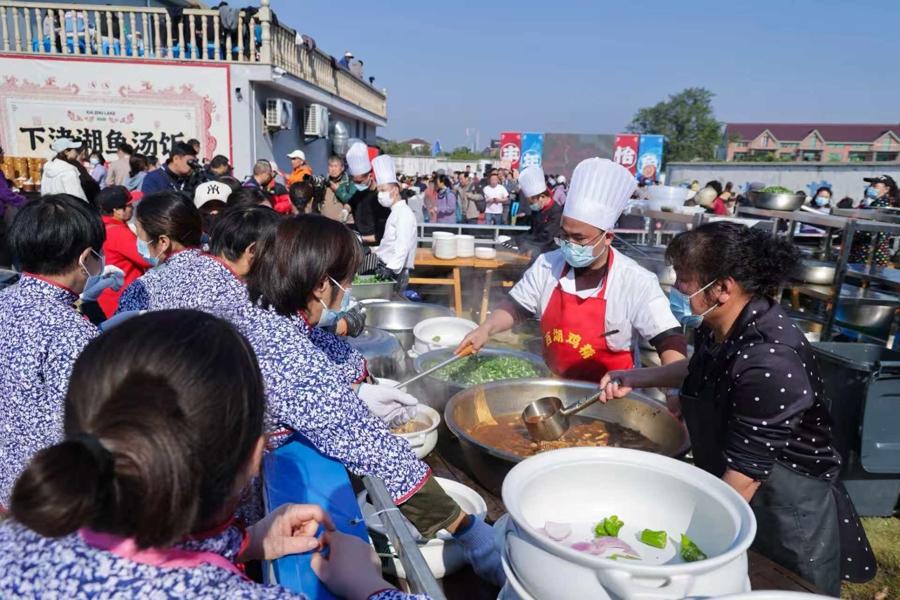 11時30分,樂島魚湯飯餐廳香氣四溢,百桌千人魚湯飯盛宴正式開席。7米高的煙囪、10 米總竈寬的土竈臺一字排開,20多位廚師以最傳統的烹飪方式,熬製出原汁原味的湖鮮大餐。宴席間,歌舞表演、非遺展示輪番上演,更有魚王拍賣、鮮魚抽獎等互動活動將氛圍推向高潮。賓客們圍坐桌前,品嚐鮮美的魚湯飯,在旖旎湖光中盡享漁家之樂。