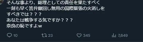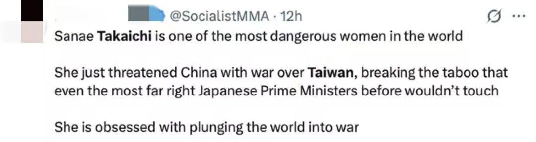 一名網友在X平臺上發文稱,高市以臺灣問題爲由威脅對中國開戰,“打破了連以往最右翼的日本首相都不敢觸碰的禁忌”,“彷彿沉迷於把世界推向戰爭”。多位網友評論稱,日本首相的言論明顯加劇地區緊張局勢,日本不應利用臺灣問題謀取政治私利,而應優先通過對話與外交維護地區穩定。