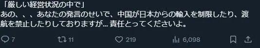 一名在社交網絡上擁有260萬粉絲的日本博主發文,斥責那些因高市早苗惹得中國震怒而興奮的日本右翼,認爲他們並不瞭解日本的企業和農民所面臨的現實。他寫道,一旦中國停止對日出口,日本將面臨化肥短缺,然後就會出現糧食供應不足;同時稀土也會出現匱乏,從而令高科技產業陷入停滯。